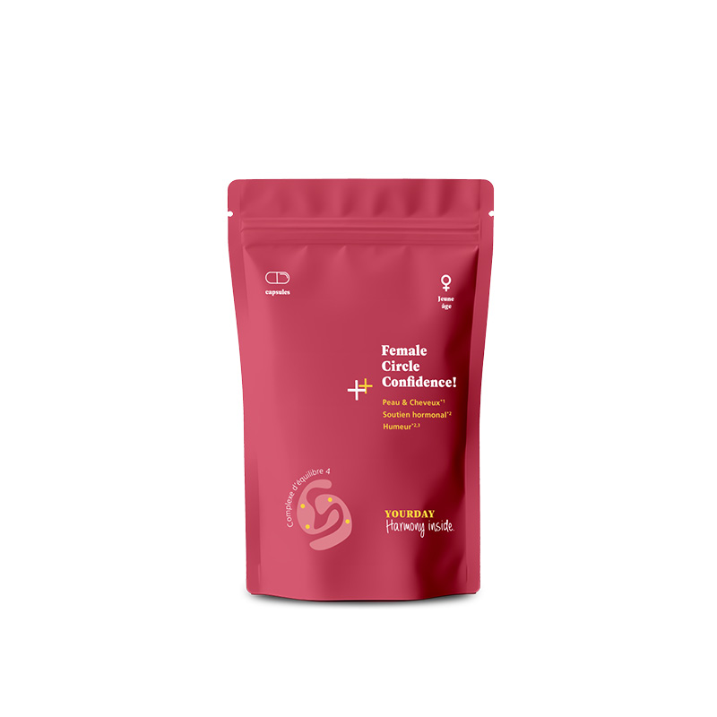 Sentez-vous belle - de l'intérieur et de l'extérieur. Même pendant les règles. YOURDAY Female Circle Confidence! peut, grâce à la puissance d'une composition parfaitement équilibrée, soutenir votre bien-être chaque jour de votre cycle. Des vitamines et minéraux importants, dont votre corps a besoin pendant cette phase de vie, vous sont fournis avec seulement 2 capsules par jour et peuvent contribuer à réguler l'activité hormonale dans le corps (la vitamine B6 contribue à réguler l’activité hormonale). Le zinc contribue au maintien d'une peau, de cheveux et d'ongles normaux - un bel effet secondaire d'un corps équilibré. Le complexe équilibre 4 avec ses 4 composants coordonnés (zinc, extrait de racine de maca rouge, extrait de racine de curcuma et extrait de baies de maqui) vous apporte également son soutien.