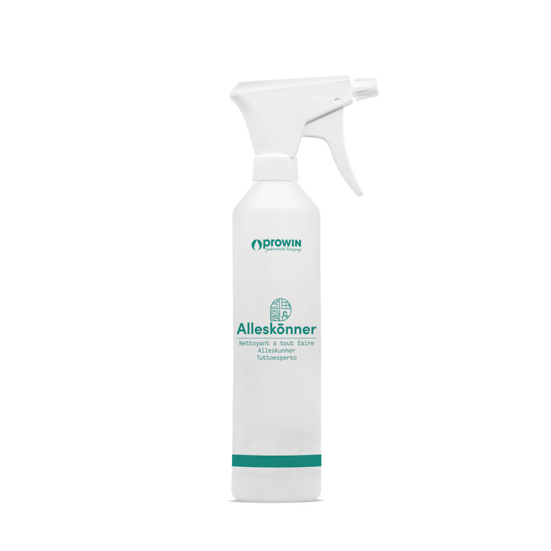 De proWIN ALLESKUNNER sproeifles van stevig kunststof is dankzij de geïntegreerde doseerschaal perfect voor het eenvoudig mengen van het reinigingsconcentraat proWIN ALLESKUNNER met water. Door het verstelbare mondstuk kan de reinigingsoplossing optimaal gedoseerd worden en met een fijne sproeinevel tot sproeistraal doelgericht op de betreffende oppervlakken worden aangebracht. Maakt het hele huis stralend schoon.